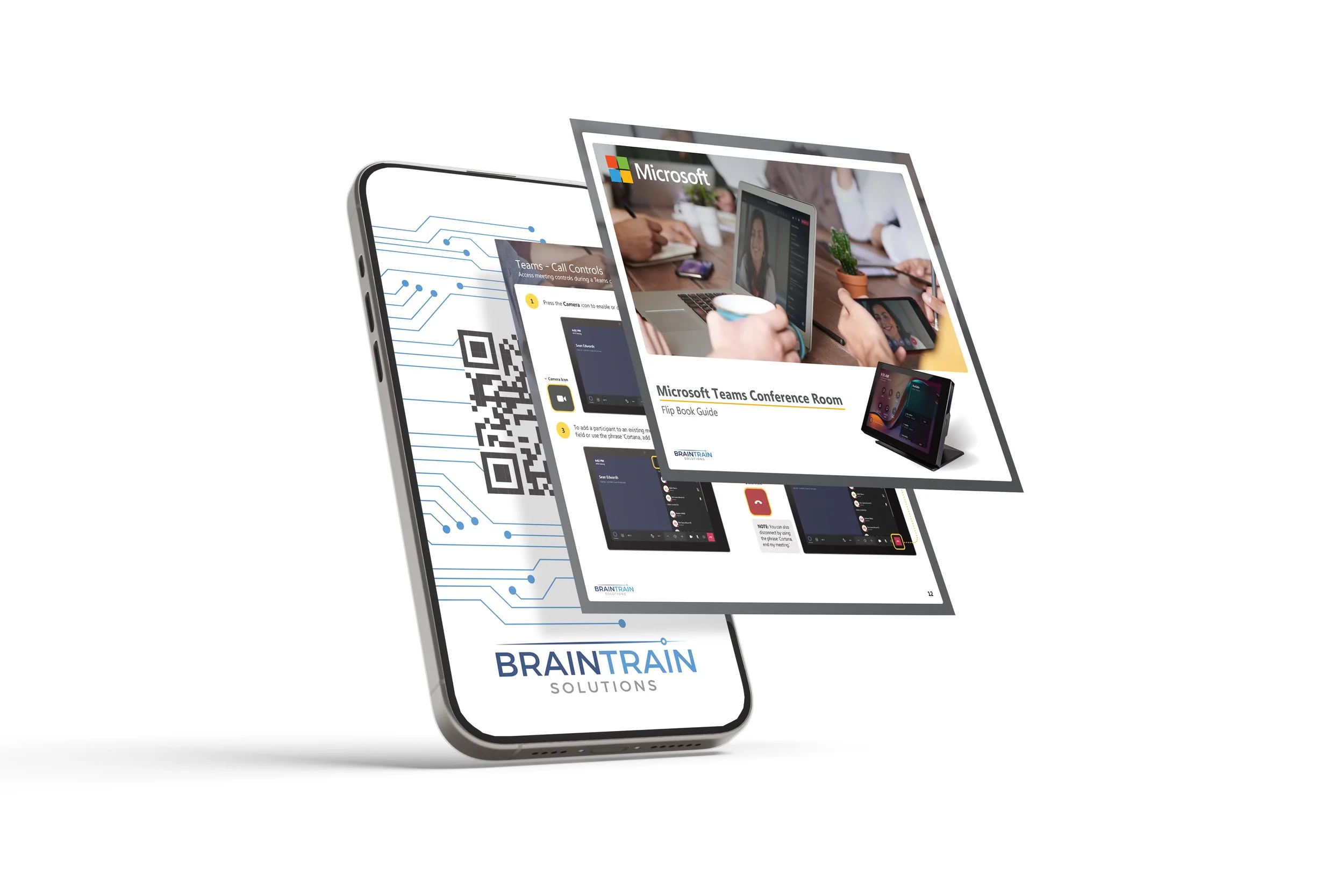 Each guide is formatted for print and typically placed in metal tabletop or wall-mounted sign holders within conference rooms, boardrooms, training rooms, multipurpose rooms, and other technology-enabled spaces. A QR code included on the guide provides direct access to expanded digital resources, such as a detailed flipbook or short video tutorial, for users who need additional guidance.